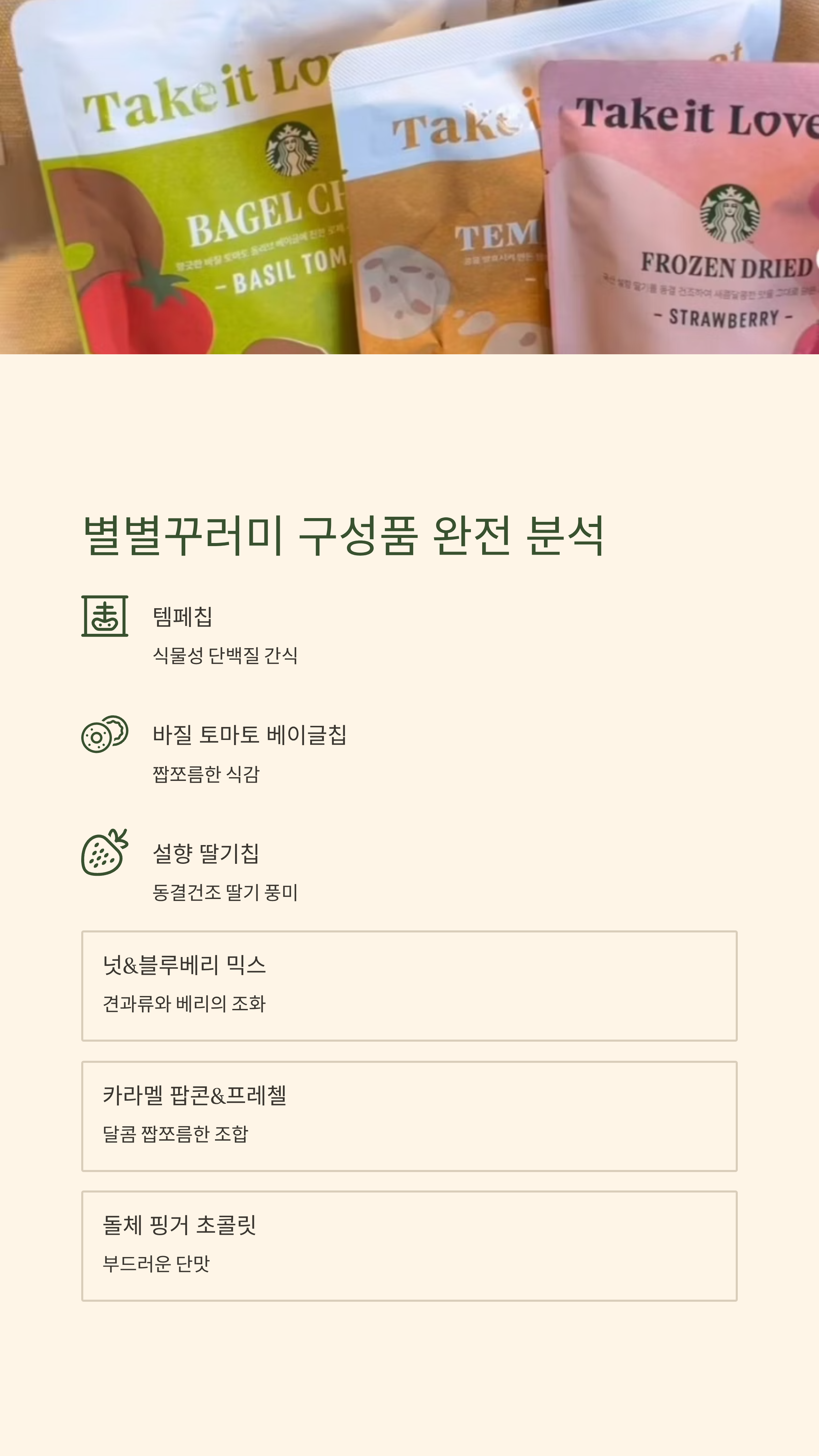 간식 6종은 스타벅스에서 이미 인기 있는 건강 스낵 중심으로 구성되어 있어요.