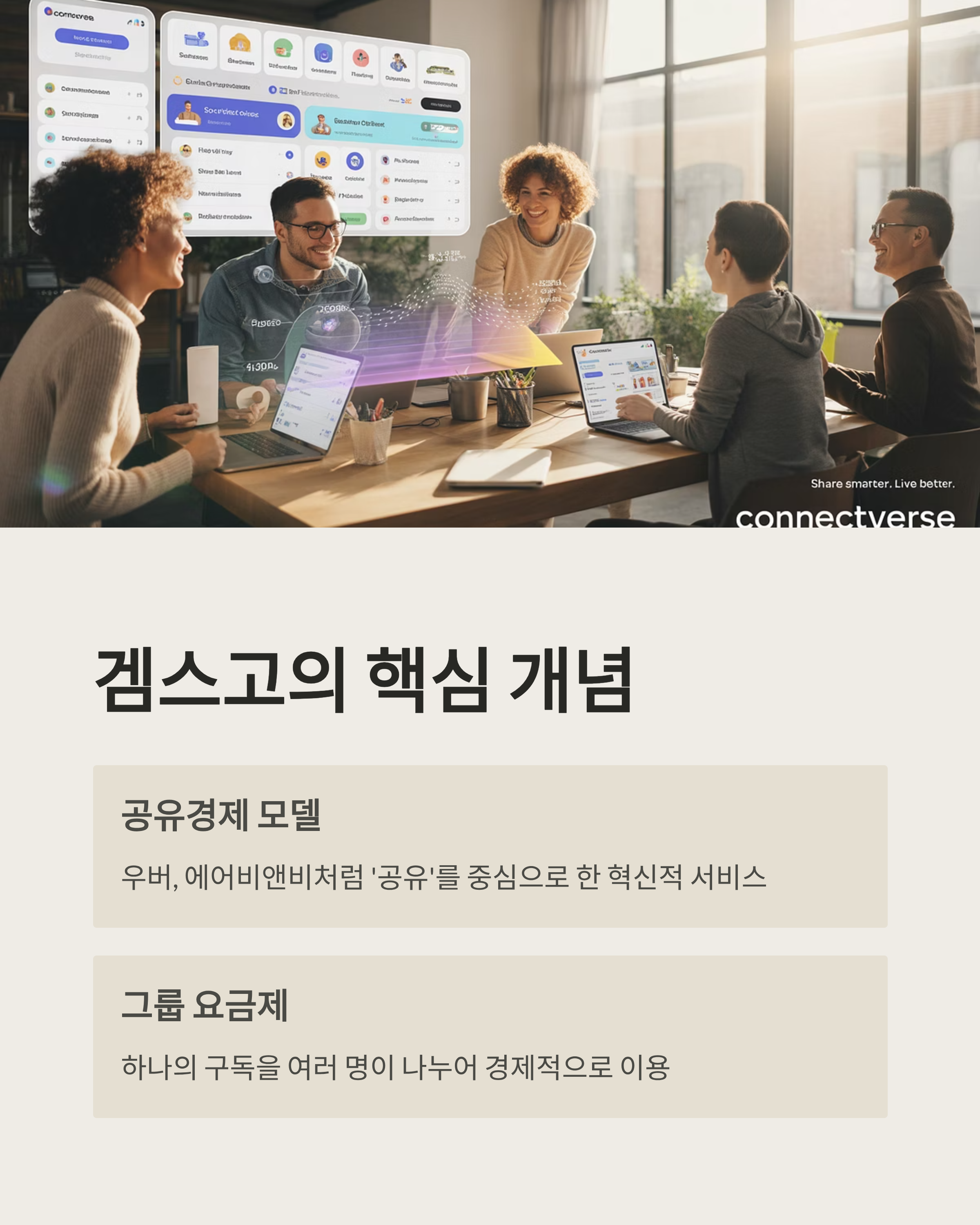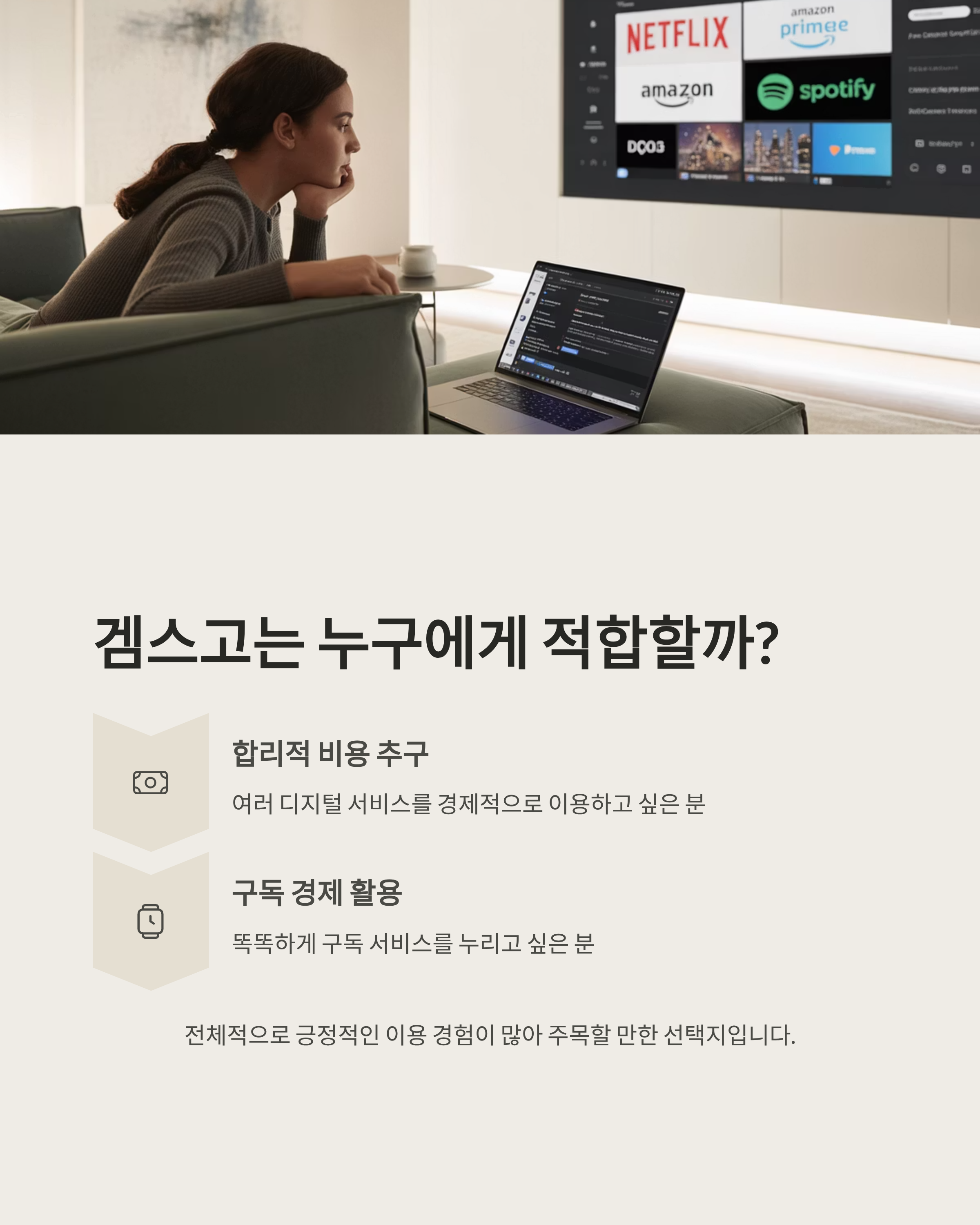 겜스고는 하나의 그룹 요금제를 여러 명이 나누어 쓰는 구조를 제공합니다. 우버나 에어비앤비처럼 ‘공유’를 중심에 두고, 다양한 디지털 구독을 경제적으로 즐길 수 있도록 돕는 것이 특징입니다.