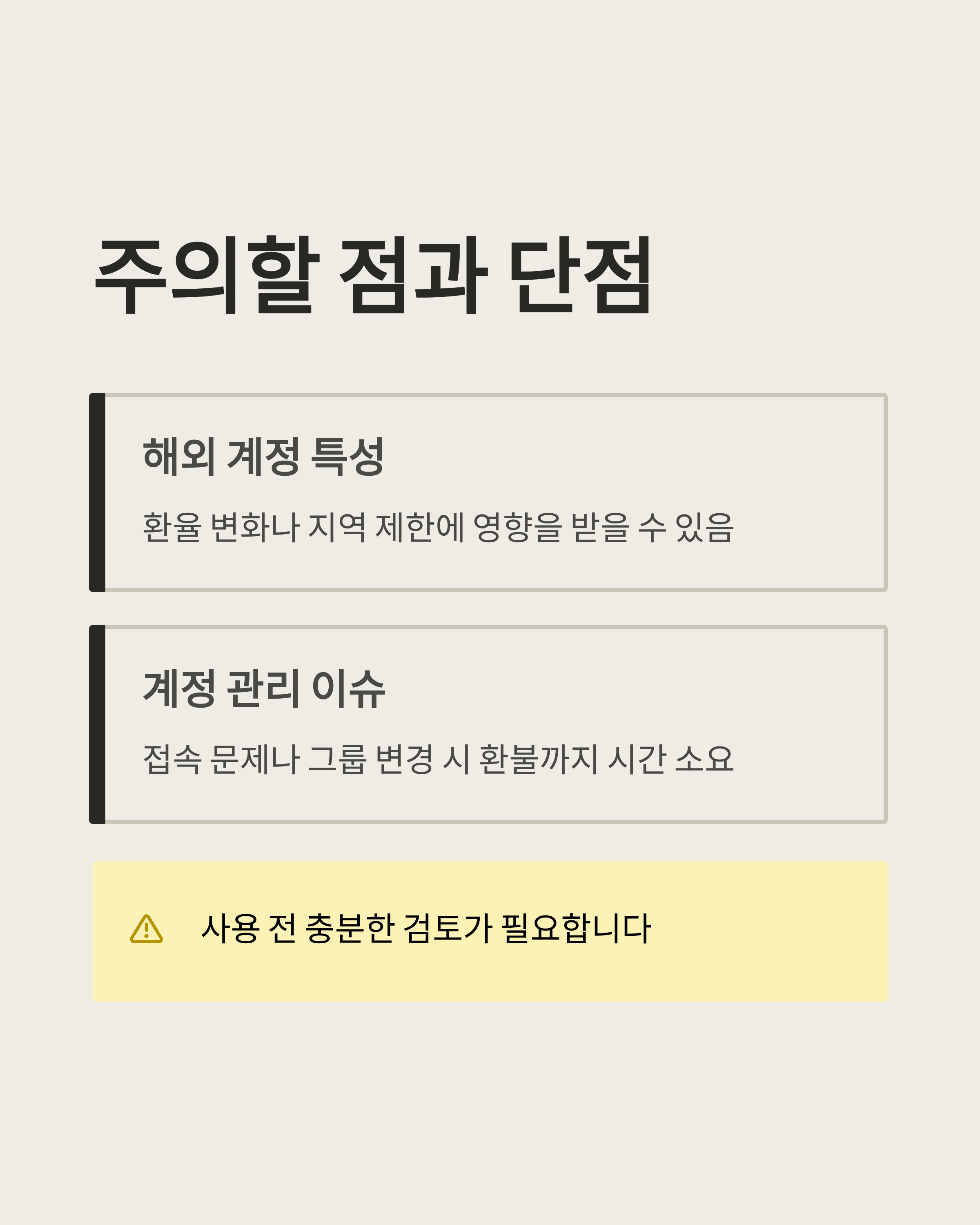 일부 서비스는 해외 계정 위주로 제공되기 때문에 환율 변화나 지역 제한에 영향을 받을 수 있습니다. 또한 계정 접속 문제나 그룹 변경 상황에서는 환불까지 시간이 걸리는 경우도 있다는 후기가 있습니다.