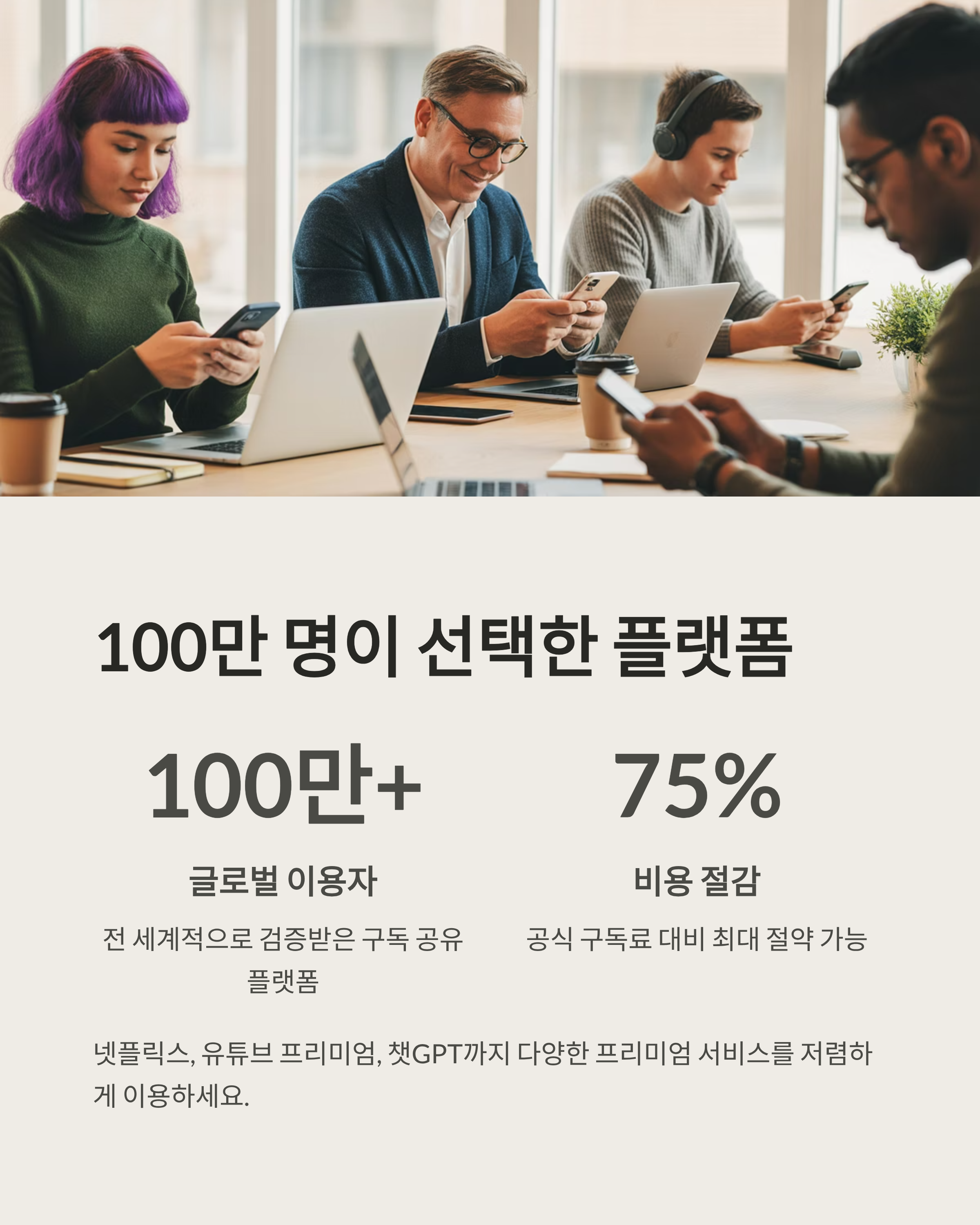 가격이 공식 구독료보다 크게 저렴하다는 점은 가장 큰 장점으로 꼽힙니다. 특히 최대 75%까지 비용을 아낄 수 있어 경제적 만족도가 높습니다. 또, 가입과 이용이 간단하고 고객 지원도 신속하다는 의견이 많습니다.