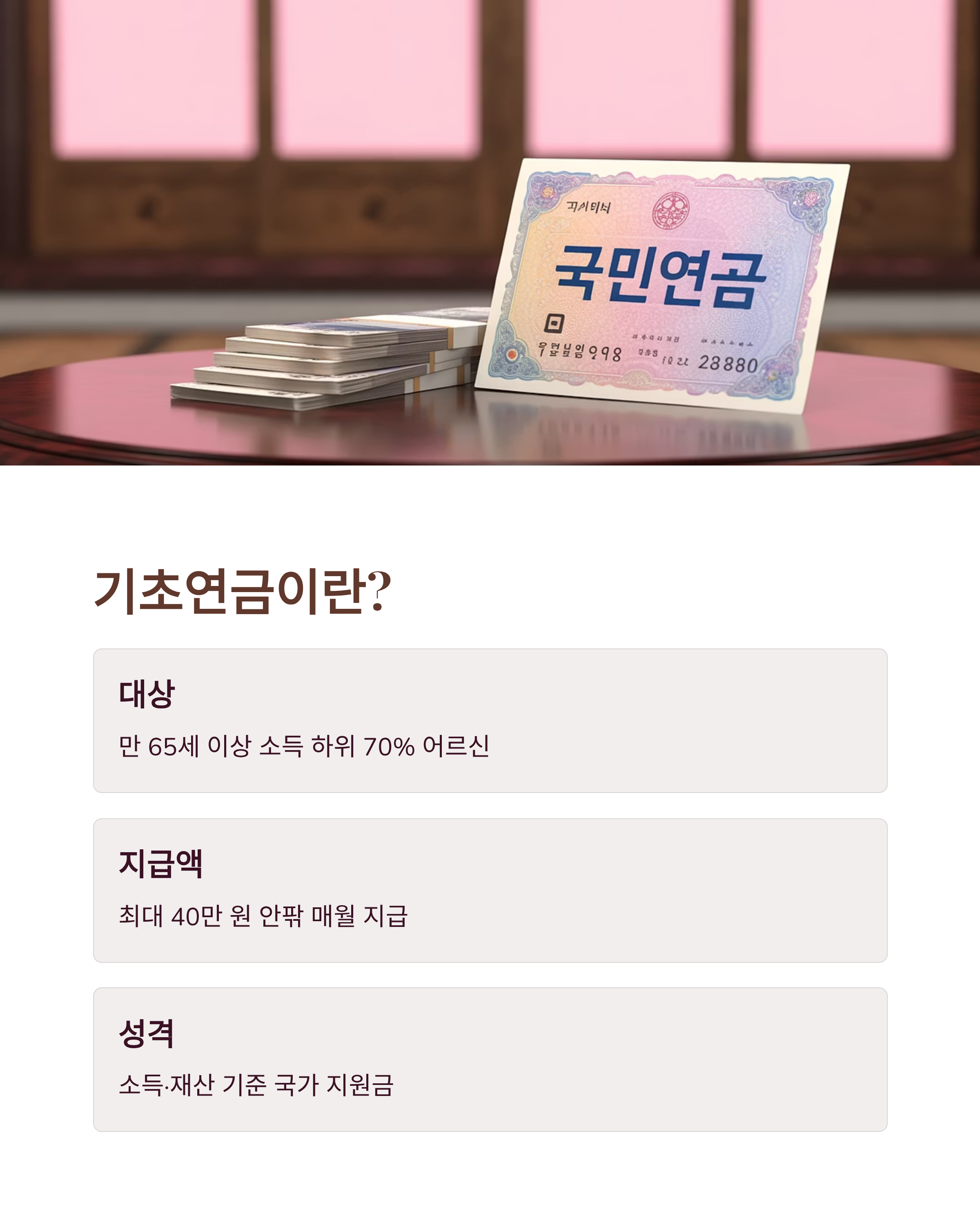 | 지급 기준 | 정해진 소득·재산 조사 | 납부 기간·금액·가입기간 반영 |