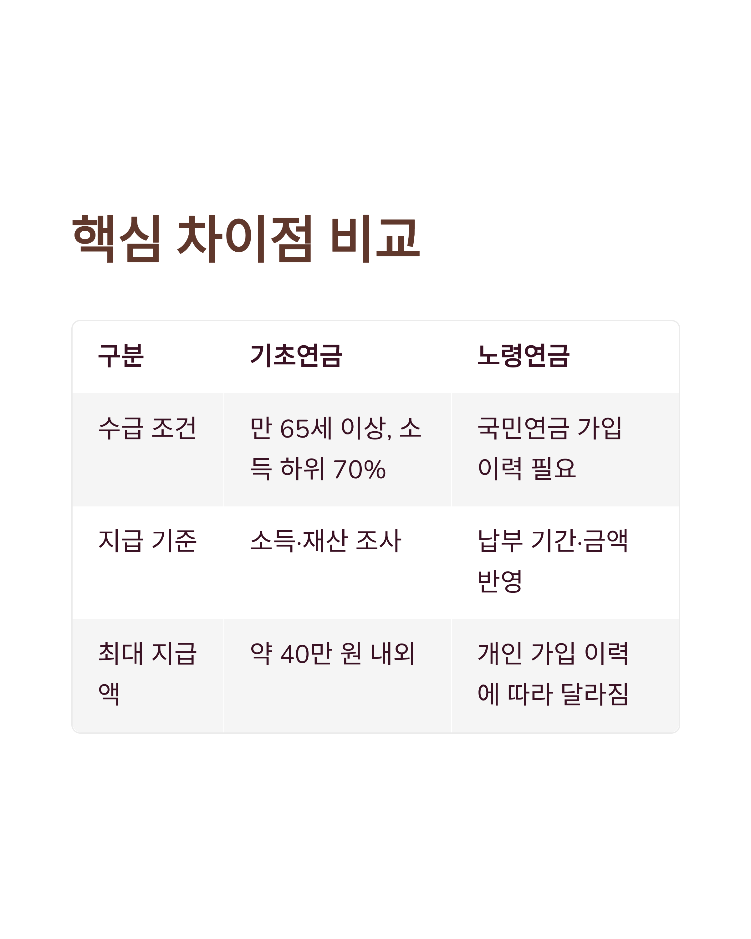 | 수급 조건 | 만 65세 이상, 소득 하위 70% | 국민연금 가입 이력 필요 |