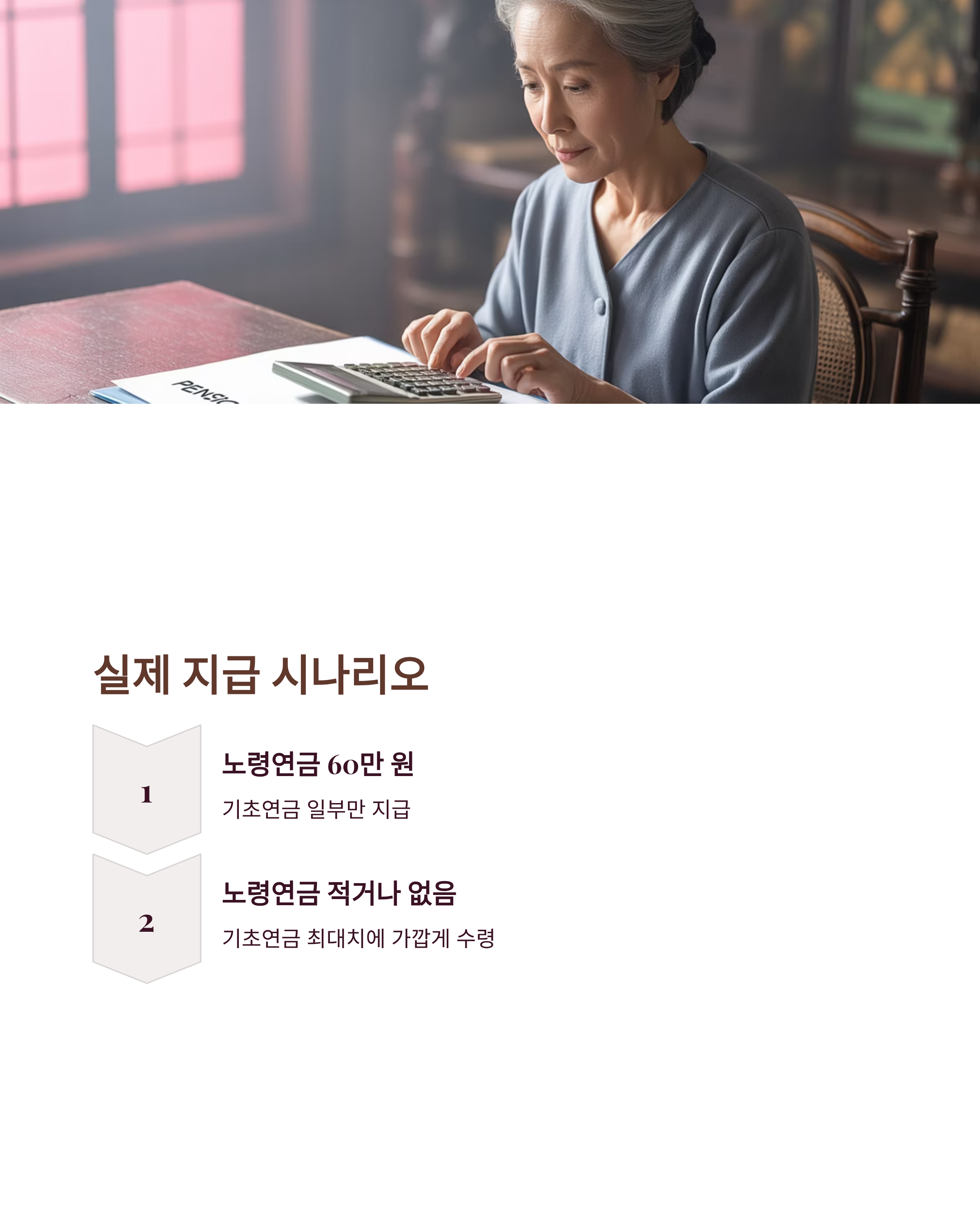 예를 들어, 노령연금으로 매월 60만 원을 받는 분이라면 기초연금은 전액이 아닌 일부만 지급됩니다. 반대로 노령연금액이 적거나 거의 없다면 기초연금을 최대치에 가깝게 받을 수 있습니다.