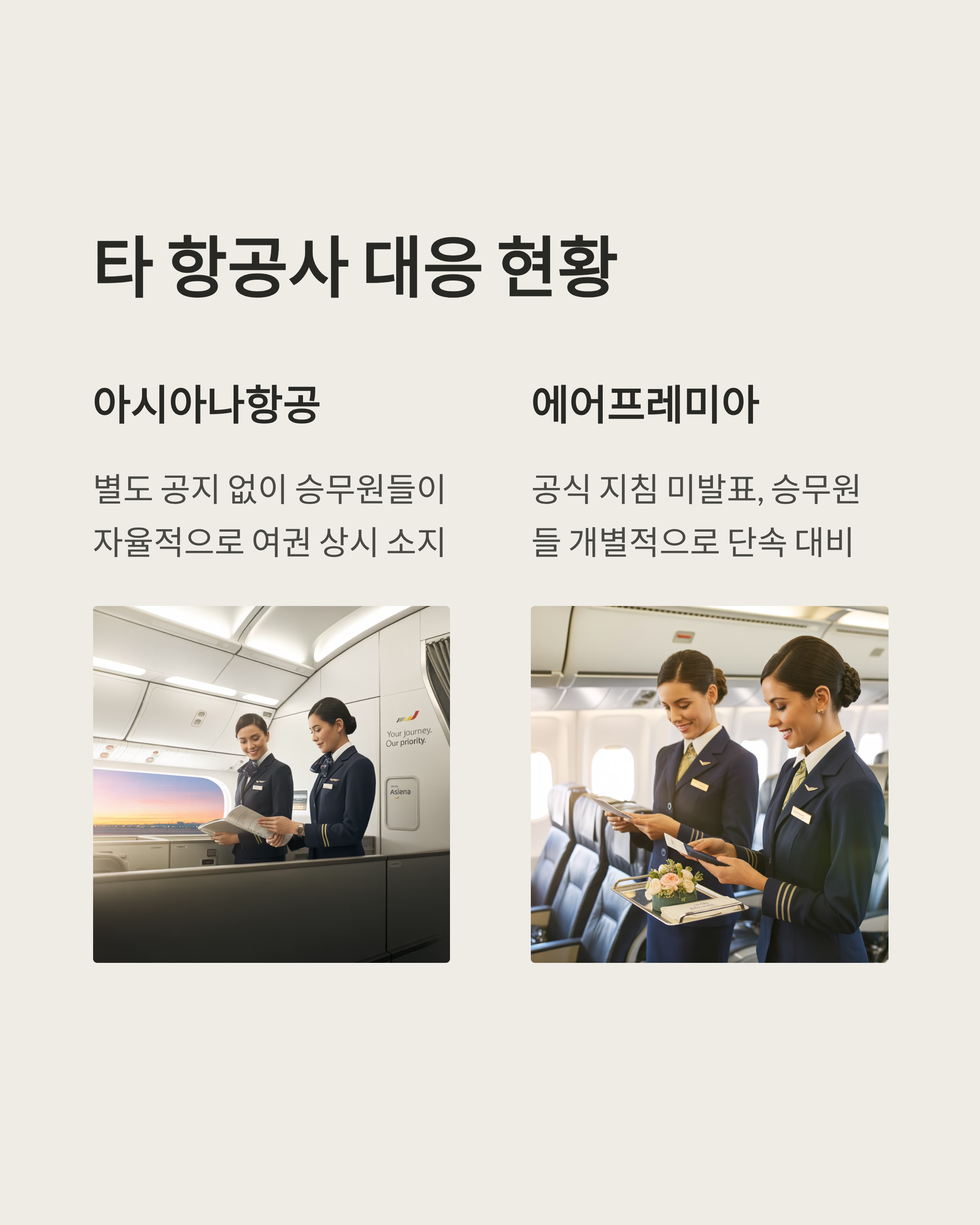 아시아나항공과 에어프레미아는 별도의 공지를 내리진 않았지만, 승무원들이 자율적으로 여권을 항상 소지하고 단속에 대비하고 있습니다. 미국 노선에 투입되는 모든 승무원들이 비슷한 긴장감을 느끼고 있는 것입니다.