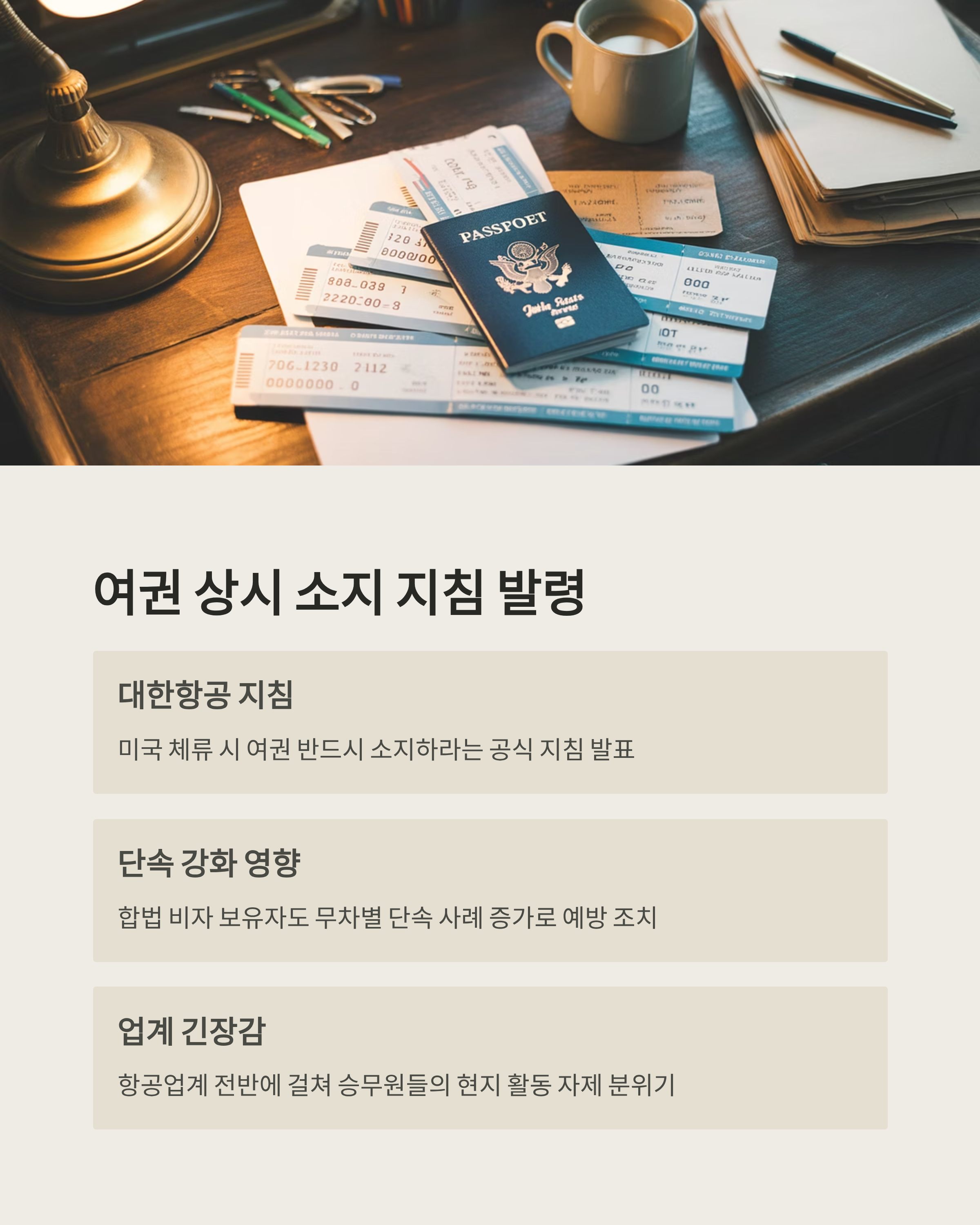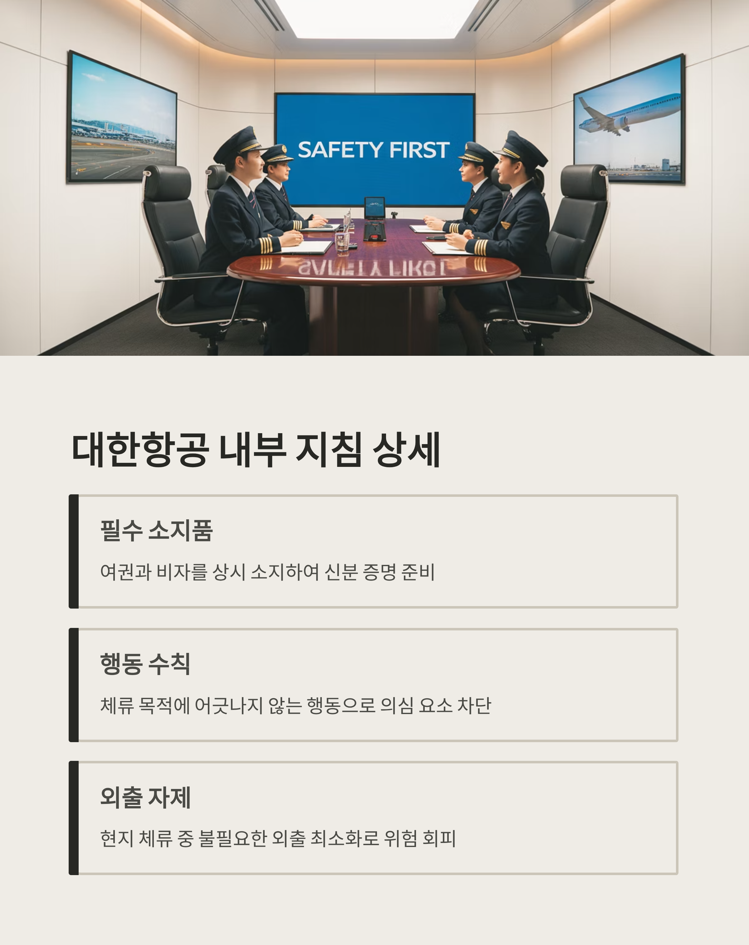 대한항공은 미국 노선을 오가는 승무원들에게 "여권과 비자를 상시 소지하고, 체류 목적에 어긋나지 않는 행동을 할 것"을 당부했습니다. 이는 단순한 권고를 넘어 사실상 필수 수칙으로 자리 잡고 있으며, 현지 체류 중 불필요한 외출도 자제하라는 분위기가 형성되고 있습니다.