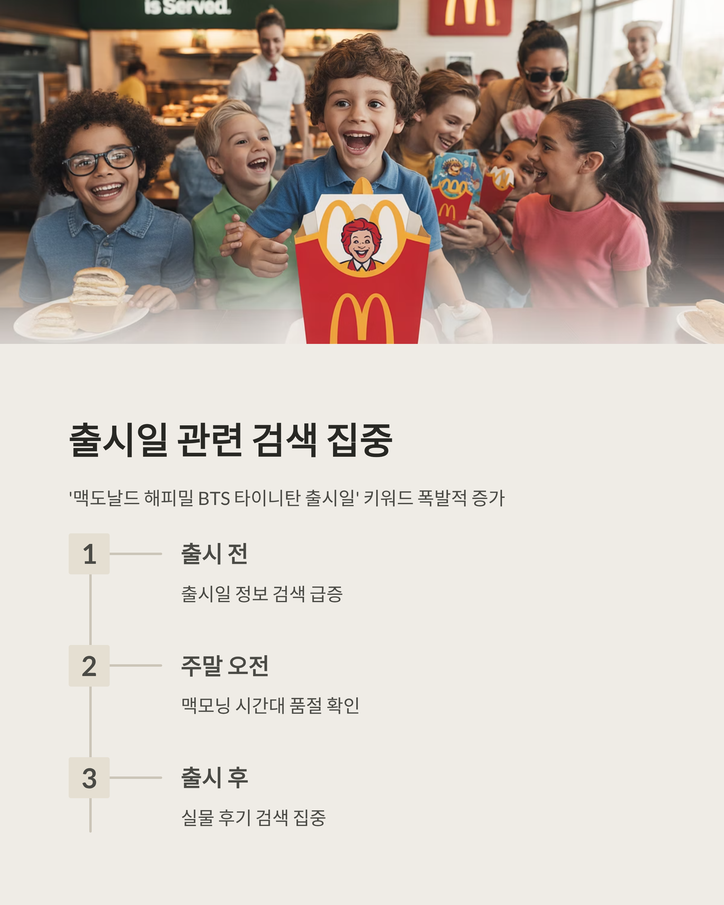 ‘맥도날드 해피밀 BTS 타이니탄 출시일’ 키워드가 출시 전후 검색 상위권에 올랐습니다. 특히 맥모닝 시간대 품절 여부를 확인하려는 검색이 급증했습니다. 팬이라면 아침부터 대기하는 열정을 보이기도 했습니다.