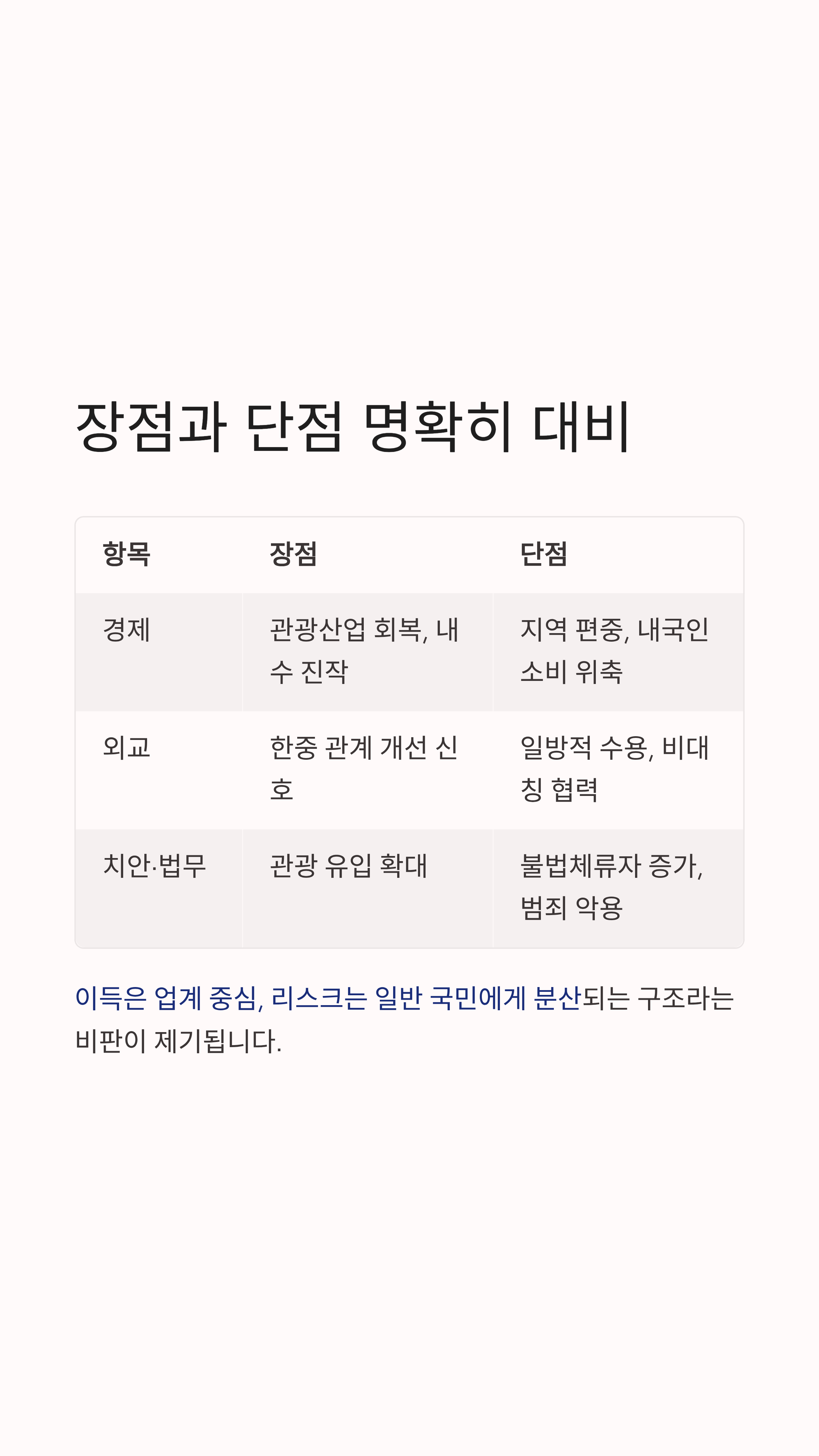 | 치안 · 법무 | 관광 유입 확대 | 불법체류자 증가, 범죄 악용 가능성 |
