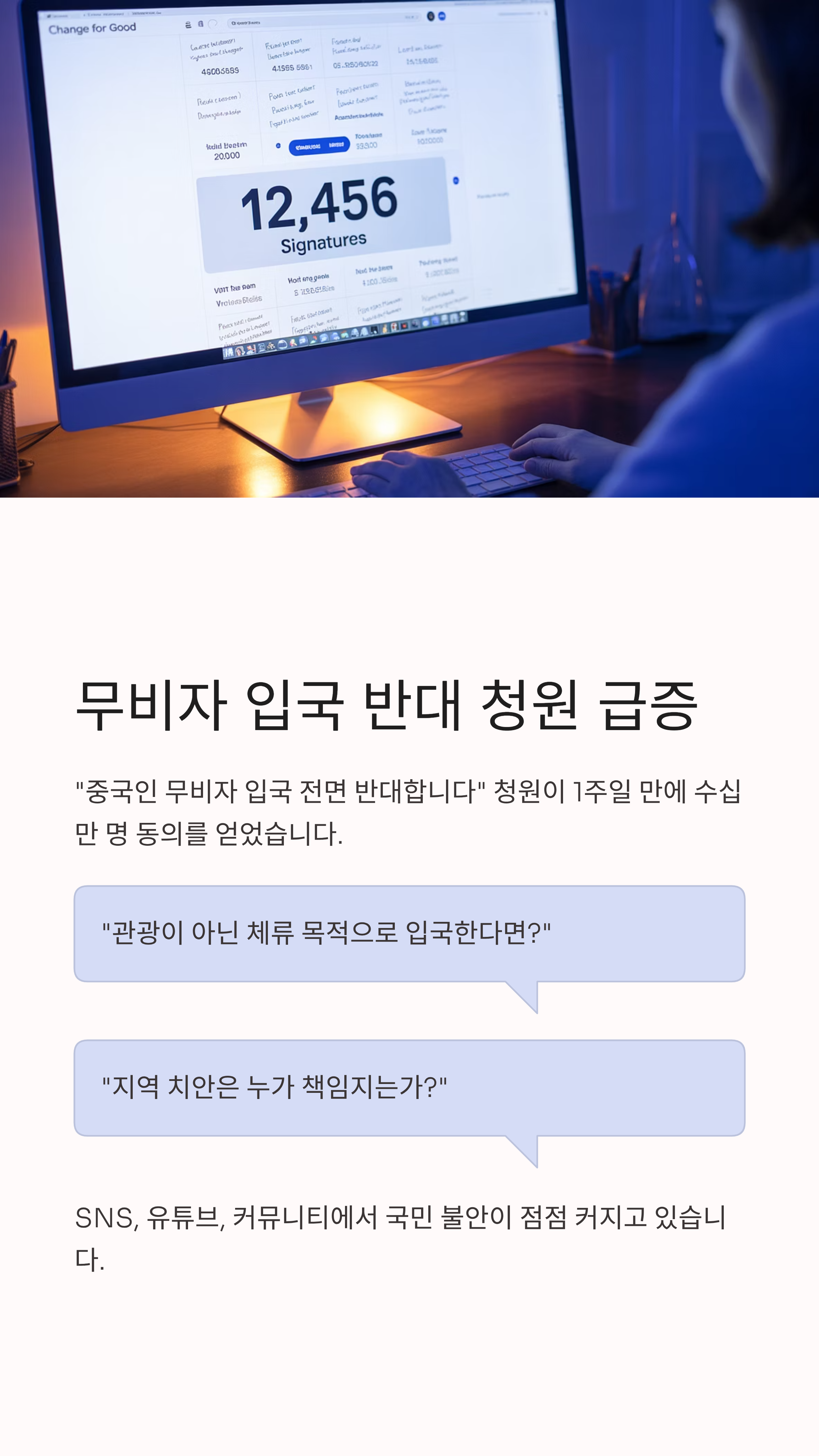 “중국인 무비자 입국 반대” 관련 청원이 급속도로 확산되고 있으며