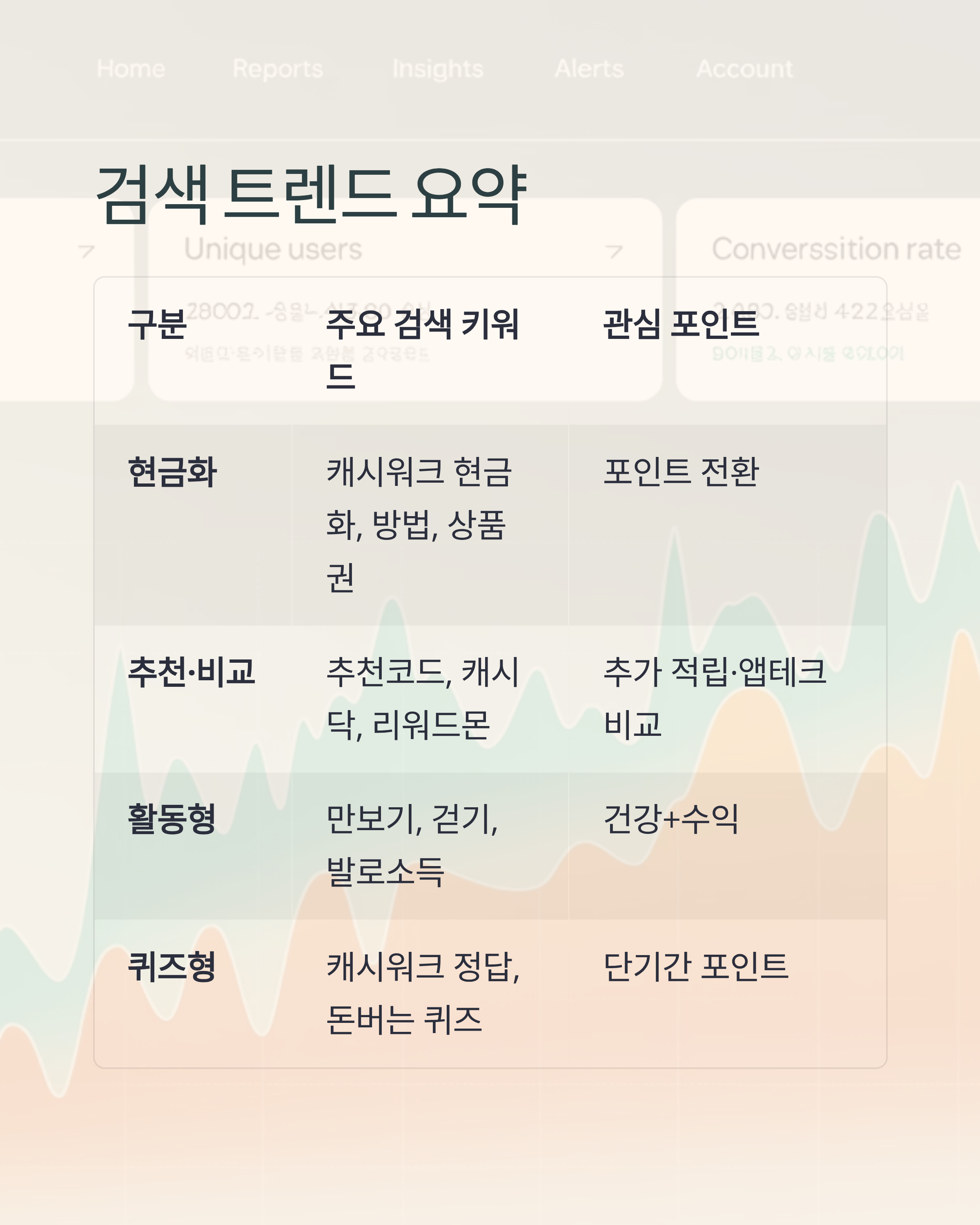 검색 비율은 여성 사용자가 남성보다 조금 더 높게 나타났습니다. 연령대별로는 20~30대에서 앱테크와 짠테크에 대한 관심이 활발하고, 40대 이상은 건강 관리와 함께 부수입 기능에 매력을 느끼는 경우가 많습니다.