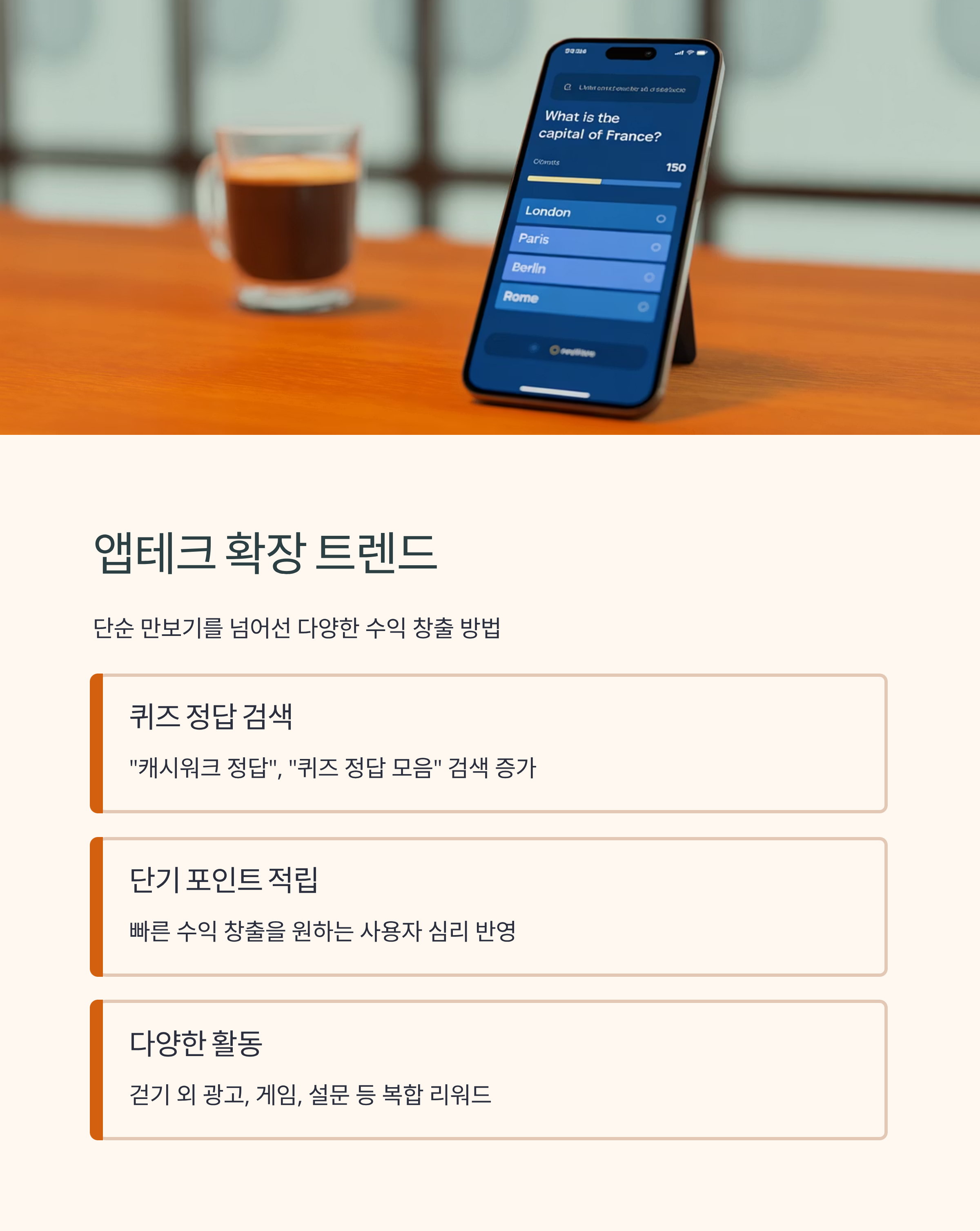 최근에는 단순 만보기 기능을 넘어 “캐시워크 정답”, “퀴즈 정답 모음” 같은 검색도 늘고 있습니다. 이는 단기간 포인트 적립을 원하는 사용자의 심리를 반영한 흐름이라 할 수 있습니다.