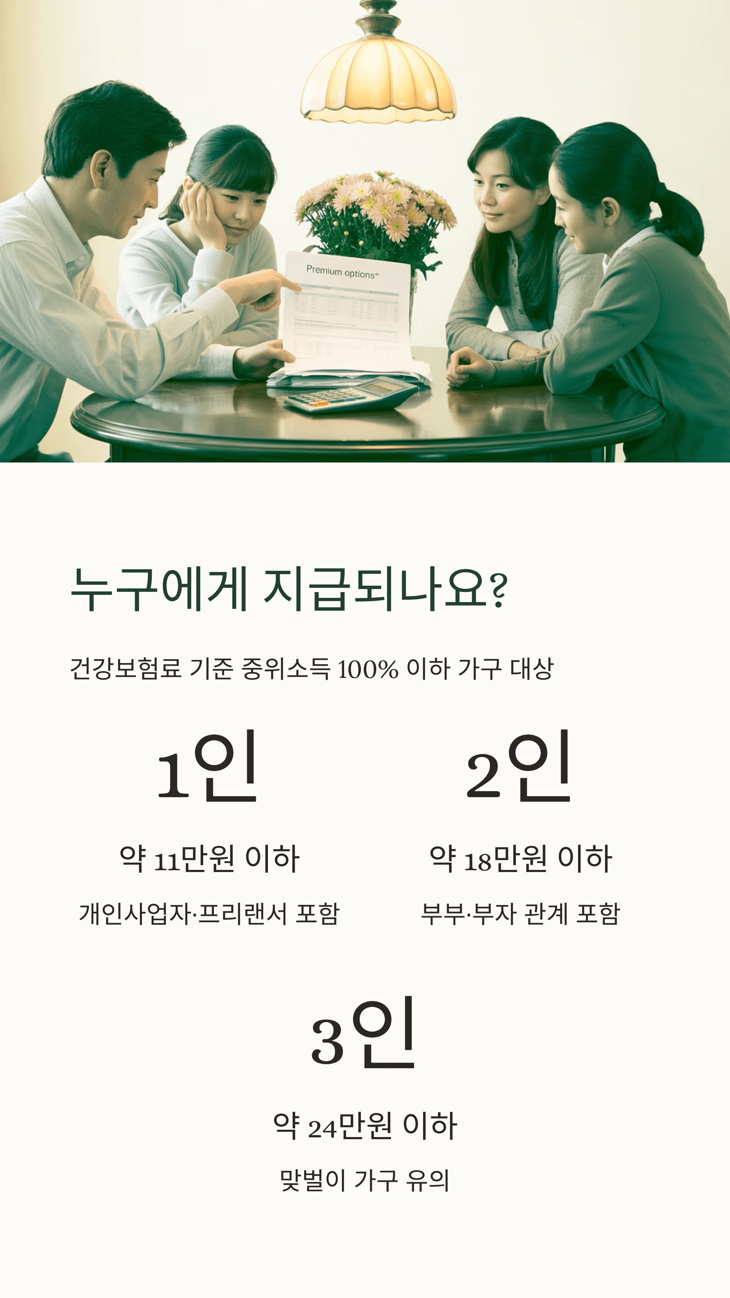 | 3인 가구 | 약 24만 원 이하 | 맞벌이 가구 유의 |