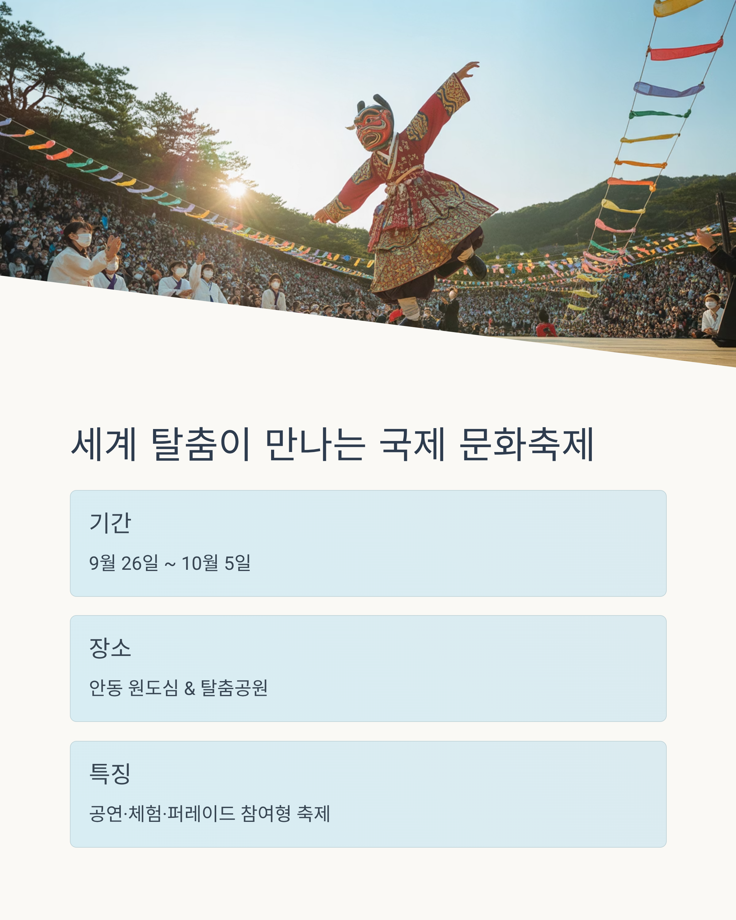 안동국제탈춤페스티벌은 한국 전통 탈춤과 세계 각국의 가면무용을 한자리에서 만날 수 있는 국제 문화 축제입니다. 2025년에는 9월 26일부터 10월 5일까지 안동 원도심과 탈춤공원 일대에서 열리며, 공연·체험·퍼레이드가 어우러지는 참여형 축제로 꾸며집니다. 셔틀버스와 임시주차장이 운영되어 접근성도 좋아, 남녀노소 누구나 편하게 즐길 수 있습니다.