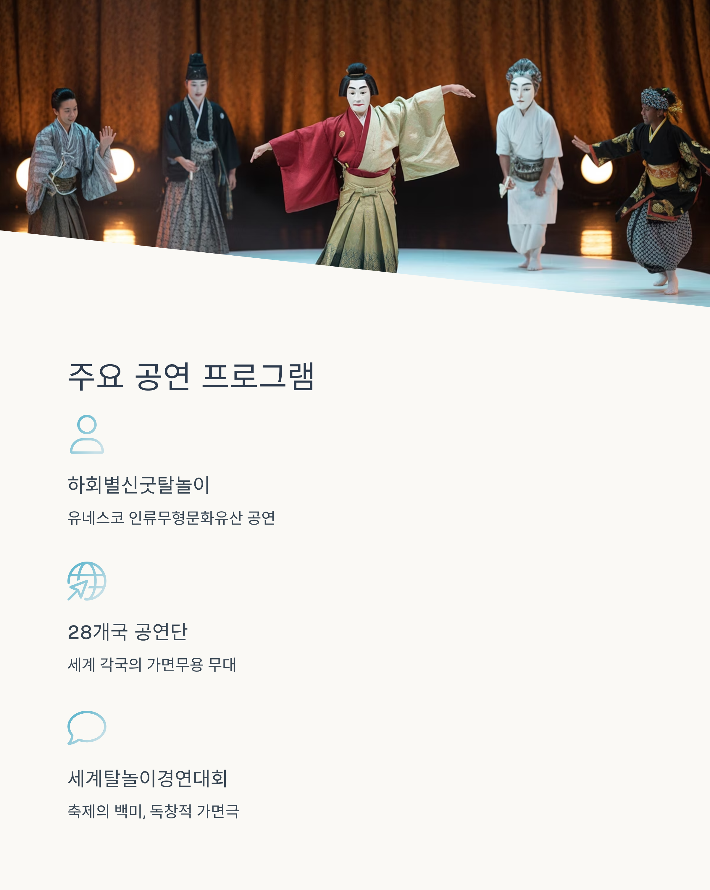 유네스코 인류무형문화유산인 하회별신굿탈놀이부터 28개국 공연단의 무대까지, 국내외 탈춤을 함께 감상할 수 있습니다. 특히 세계탈놀이경연대회는 축제의 백미로 꼽히며, 각국의 독창적인 가면극을 한자리에서 볼 수 있습니다.