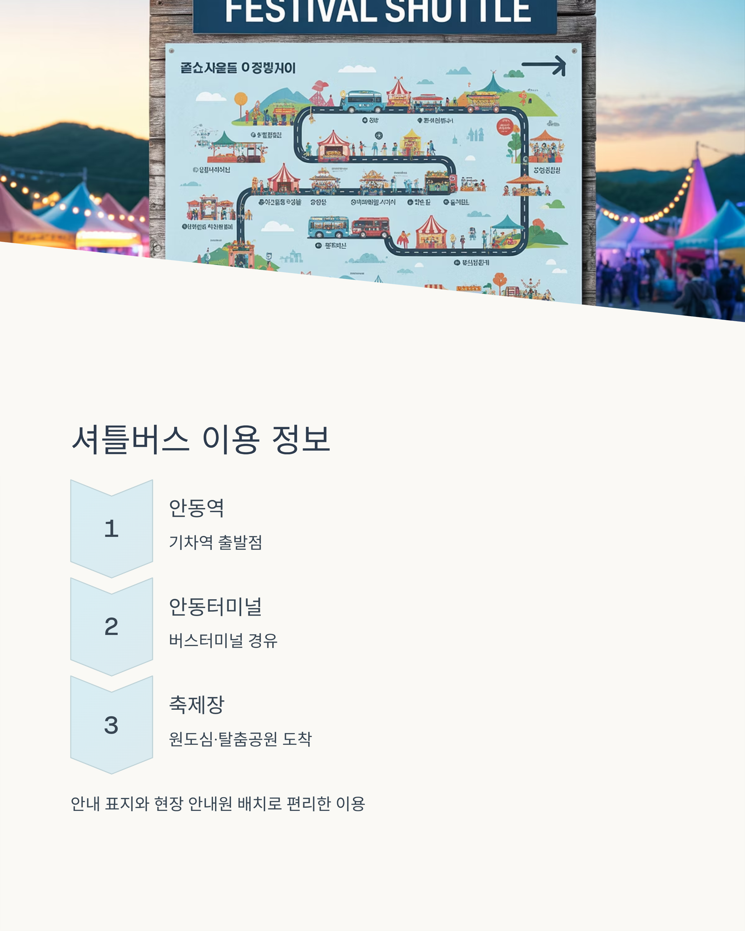 셔틀은 안동역, 안동터미널, 주요 임시주차장과 축제장을 잇습니다. 정류장에는 안내 표지와 현장 안내원이 배치되어 있어 처음 방문하는 사람도 어렵지 않게 이용할 수 있습니다.
