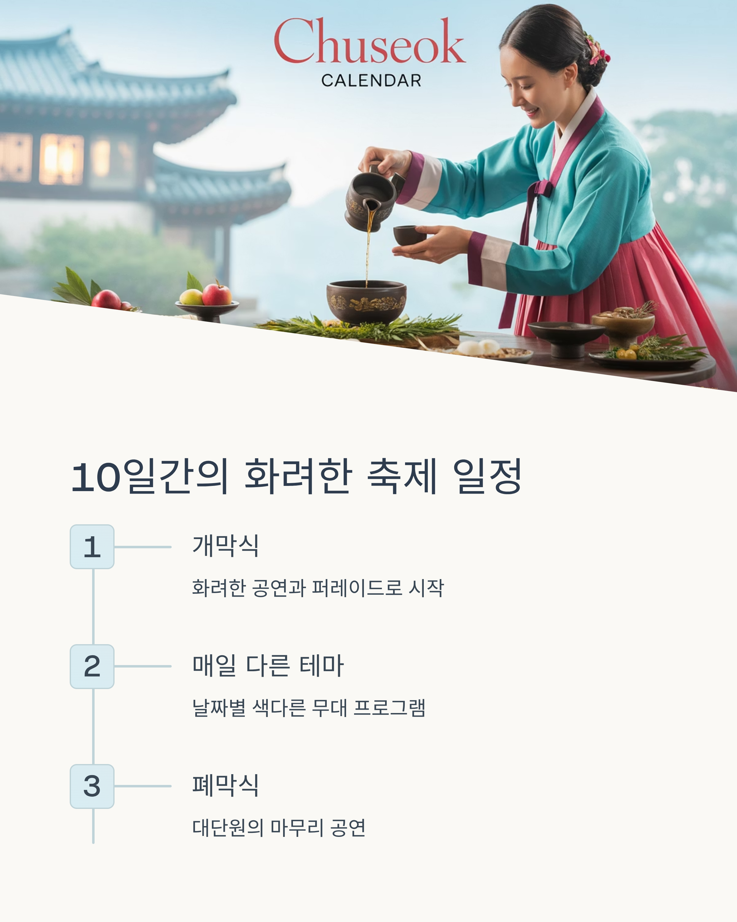 2025 안동국제탈춤페스티벌은 10일 동안 이어지며, 개막식과 폐막식은 화려한 공연과 퍼레이드로 채워집니다. 매일 다른 테마의 무대가 준비돼 있어 날짜에 따라 색다른 즐거움을 경험할 수 있습니다.
