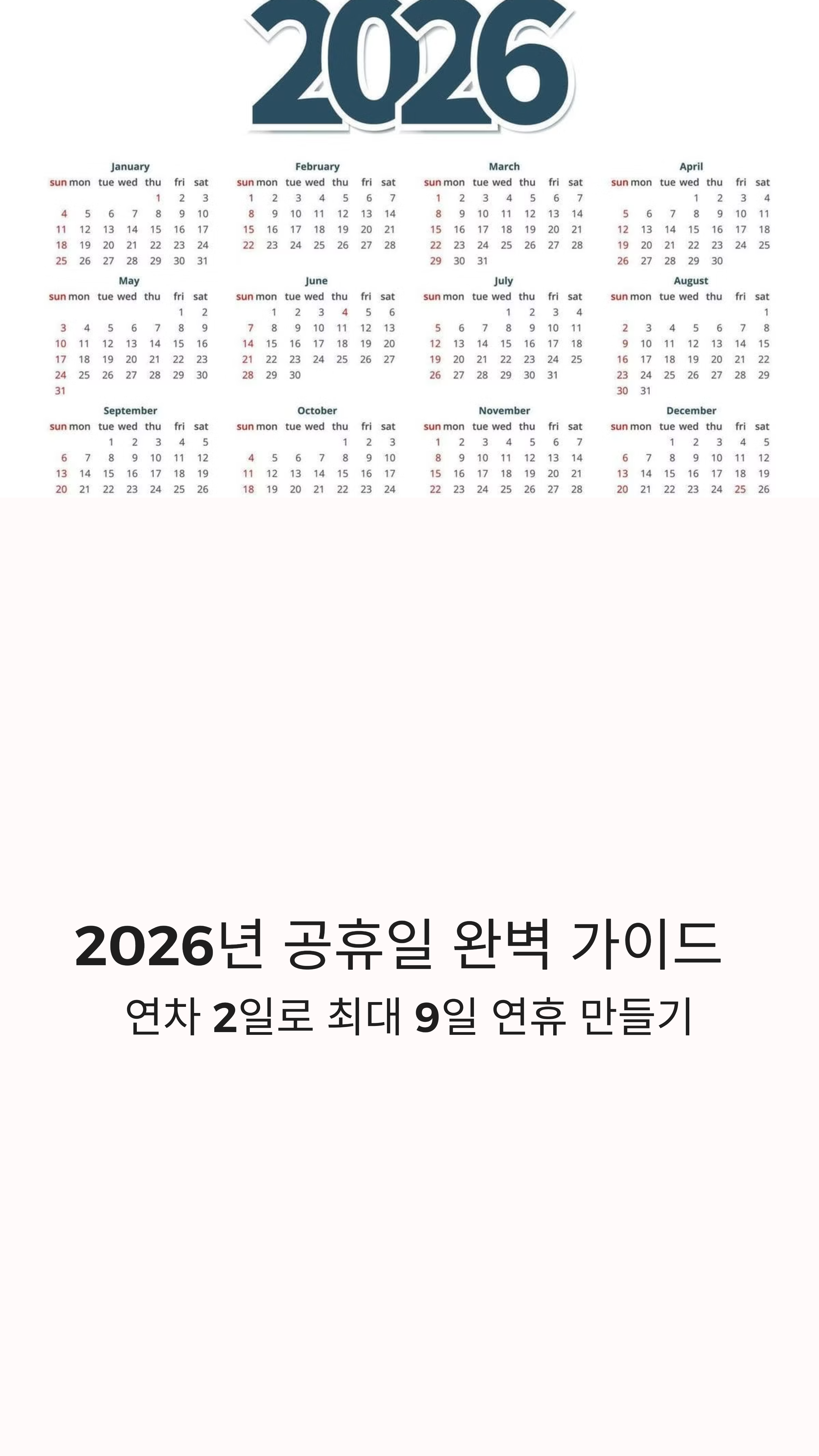 2026년은 전체적으로 쉬는 날이 많지 않은 것처럼 보여도, 연차를 잘 조합하면 길게 쉴 수 있는 구조입니다.